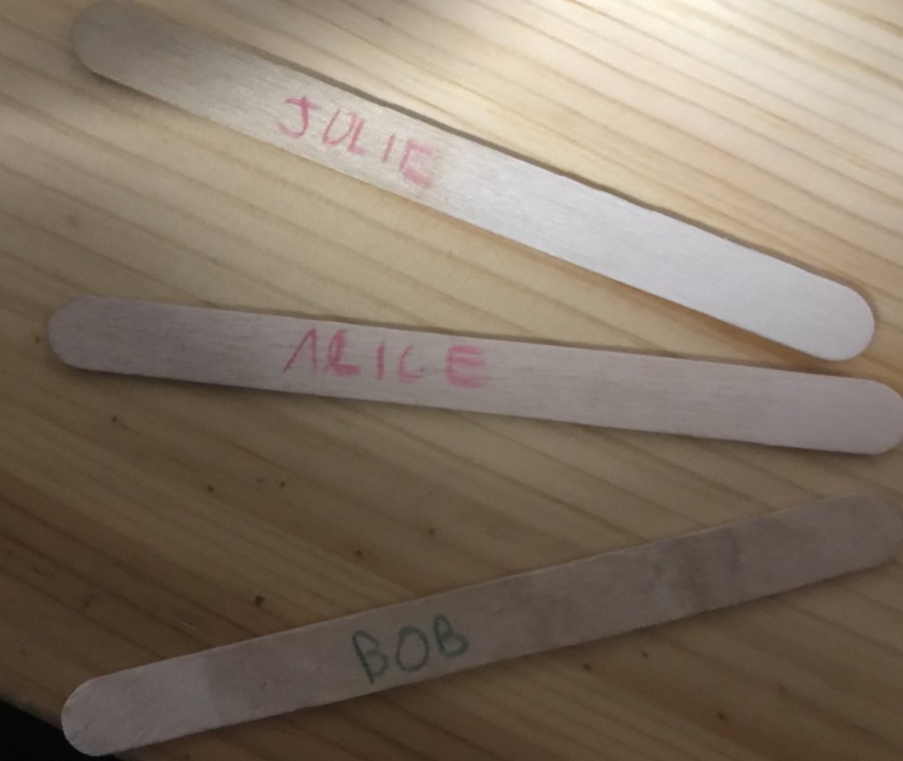 Une solution consiste alors à avoir un petit verre avec un paquet de touillette avec un prénom par touillette, et de piocher dans ce dernier lorsqu'on pose une question.